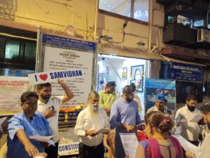 मुंबई (गुरुदत्त वाकदेकर) : भारतीय संविधान दिनाच्या अमृत महोत्सवी वर्षपूर्तीनिमित्त मैत्री संस्था, उत्प्रेरक फाउंडेशन, जनहित फाउंडेशन आणि सामाजिक कार्यकर्ता समन्वय समिती यांच्या संयुक्त विद्यमाने परळ येथील बी. आय. टी. चाळ क्रमांक १ येथे भव्य, उत्साहवर्धक व प्रेरणादायी कार्यक्रमाचे आयोजन करण्यात आले. कार्यक्रमाची सुरुवात “संविधान जागर कवी संमेलनाने” झाली. या संमेलनात मोहन जाधव, निशाताई जाधव, डॉ. संतोष कांबळे, निखिल मोंडूला आणि गुरुदत्त वाकदेकर यांनी प्रभावी कविता सादर केल्या, तर अमर काझी यांनी पोवाड्याद्वारे श्रोत्यांची मनं जिंकली. कवी संमेलनानंतर कार्यक्रमाच्या प्रमुख सत्रास सुरुवात झाली.