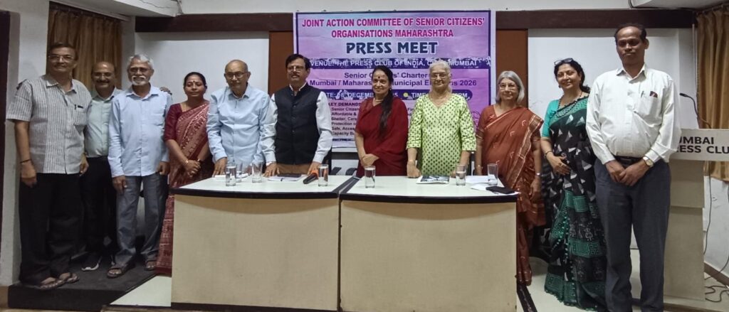 मुंबई (गुरुदत्त वाकदेकर) : महाराष्ट्रातील मुंबईसह सर्व महानगरपालिकांच्या निवडणुका लवकरच होत असून, या पार्श्वभूमीवर ज्येष्ठ नागरिकांच्या प्रश्नांकडे सातत्याने होत असलेल्या दुर्लक्षाविरोधात महाराष्ट्रातील ज्येष्ठ नागरिक संघटनांच्या संयुक्त कृती समितीने ठाम भूमिका मांडली. लाखो ज्येष्ठ नागरिकांचे “सिल्व्हर व्हॉइसेस” ऐकले गेले पाहिजेत, त्यांचा सन्मान राखला गेला पाहिजे आणि निर्णयप्रक्रियेत त्यांचा अर्थपूर्ण सहभाग सुनिश्चित केला गेला पाहिजे, अशी स्पष्ट मागणी यावेळी करण्यात आली. ज्येष्ठ नागरिक हे केवळ लाभार्थी नसून सुमारे २५ टक्के मतदानसंख्या असलेला एक महत्त्वाचा मतदारवर्ग असल्याने, त्यांच्या मागण्या दुर्लक्षित राहिल्यास आगामी महानगरपालिका निवडणुकांमध्ये ‘नोटा’ या लोकशाही पर्यायाचा वापर करण्याचा इशाराही संयुक्त कृती समितीने दिला. “ज्येष्ठांना दया नव्हे, तर सन्मान हवा,” असे ठाम मत यावेळी व्यक्त करण्यात आले.